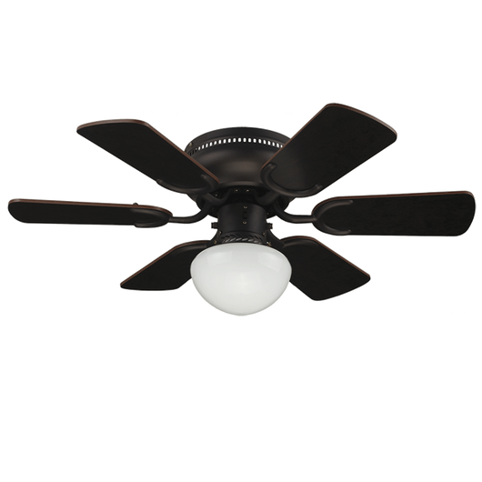 Ventilador decorativo 30” para plafon, acabado satinado, 6 aspas MDF reversibles color chocolate/maple. Incluye lámpara ahorradora y canope cubre registro.